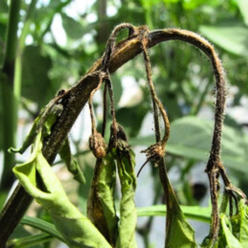 可危害辣椒的根、茎、叶和果实。幼苗染病后易猝倒。茎基部出现暗褐色水渍状病斑,常环绕茎部,导致植株萎蔫、死亡。叶片染病时出现水渍状斑,逐渐扩大。果实染病则出现褐色或黑色腐烂,表面常有白色霉层。 | Affects roots, stems, leaves, and fruits of peppers. Seedlings may collapse when infected. Water-soaked brown lesions appear on stem bases, often girdling stems, leading to wilting and plant death. Leaves show water-soaked lesions that enlarge, while fruits develop brown to black rot, often covered with white mold. |