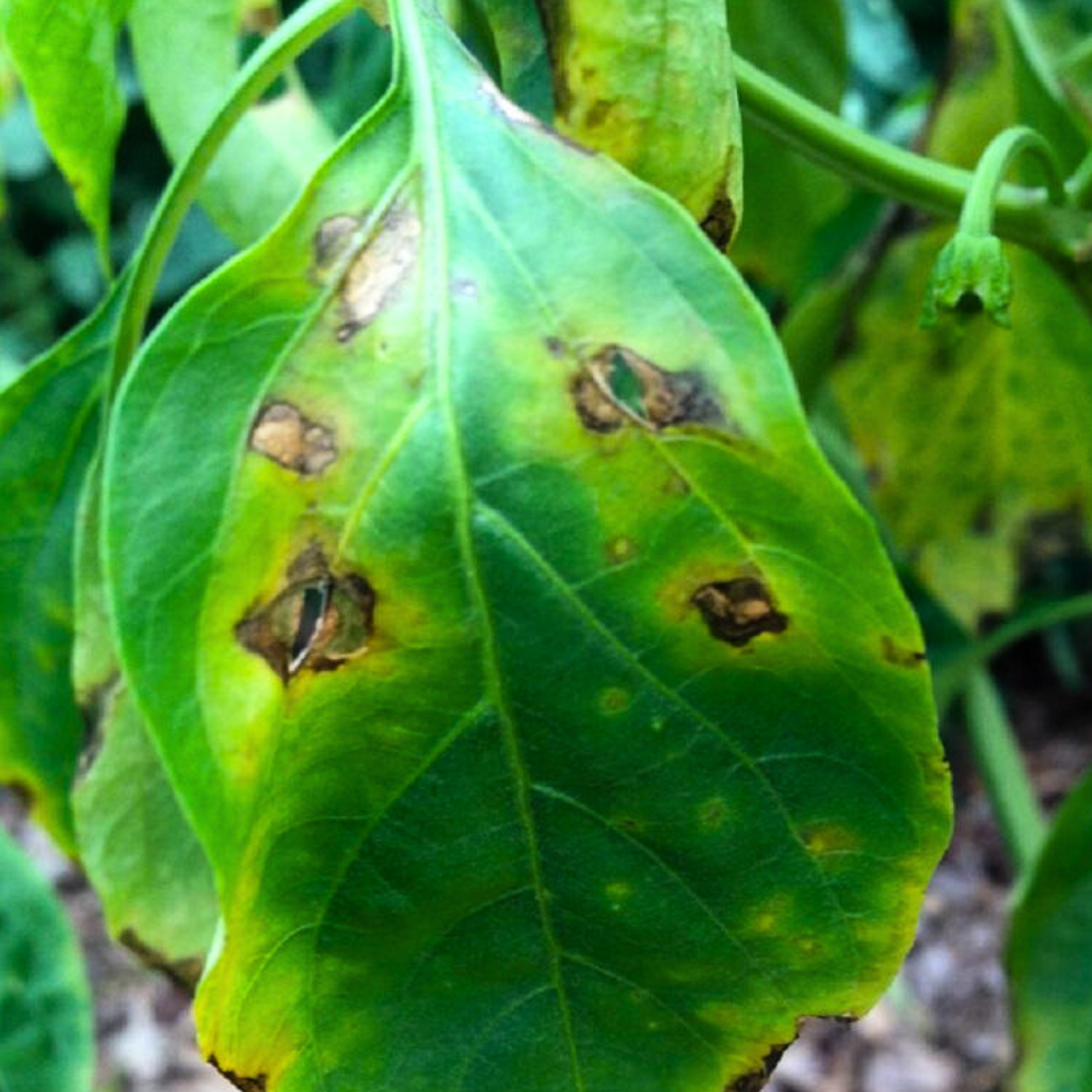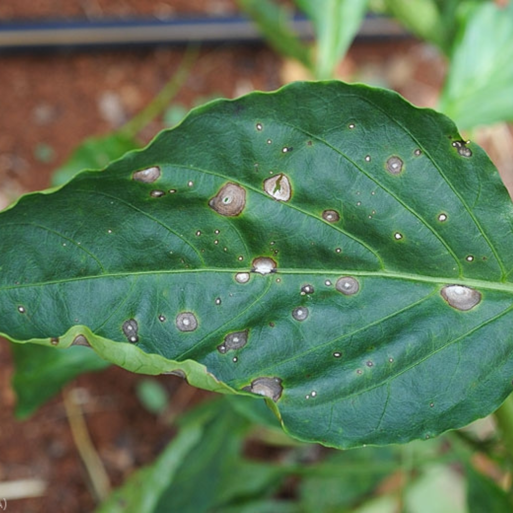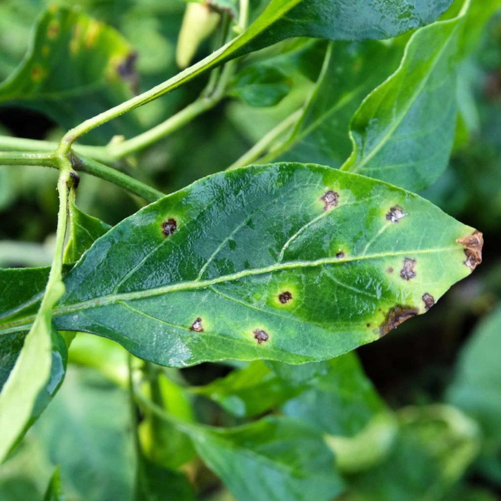 叶片出现小水渍状病斑,逐渐扩大成褐色或黑色坏死斑。果实上出现凹陷黑斑,严重影响商品性。Leaves develop small water-soaked lesions, enlarging into brown or black necrotic spots. Fruits show sunken black lesions, reducing marketability.